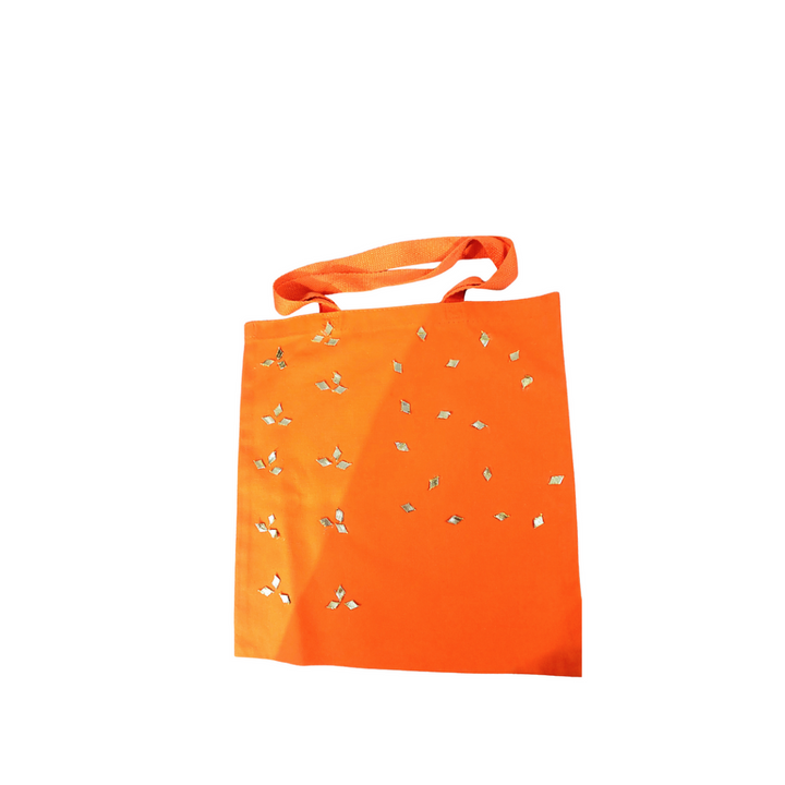 Bring style and tradition together with this beautifully crafted handmade bag. Featuring a bright orange fabric base adorned with sparkling mirror embellishments, it creates a unique and eye-catching look. Lightweight yet durable, this eco-friendly bag is perfect for shopping, books, or everyday essentials. With strong handles and a trendy design, it’s a perfect blend of practicality and charm.