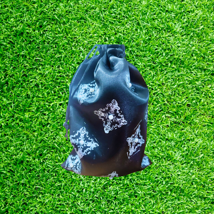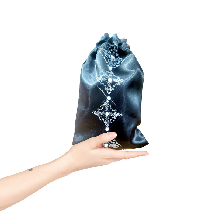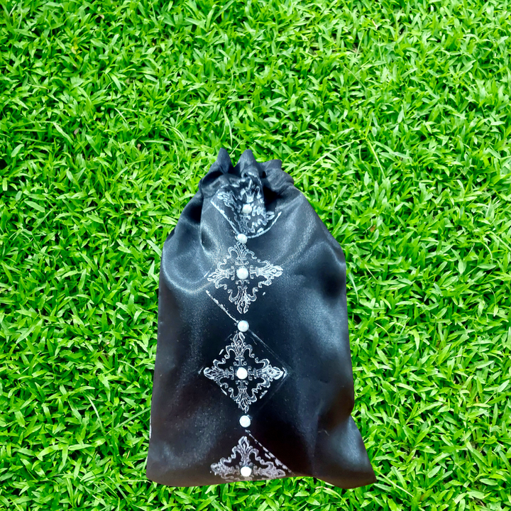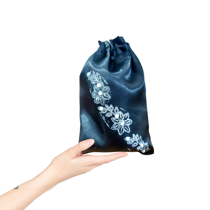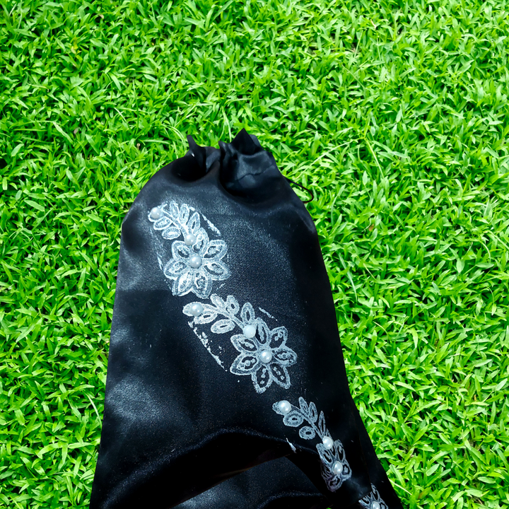 Keep your beauty essentials organized in this stunning handmade makeup pouch. Crafted with premium satin fabric in a sleek black finish, it features intricate silver embroidered patterns with pearl embellishments for a touch of luxury.